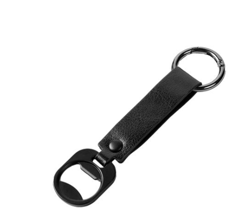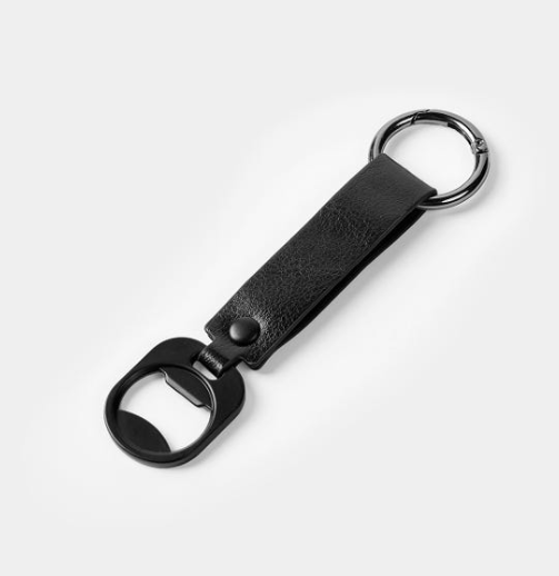 Llavero metálico con destapador, tira de curpiel y aro metálico tipo gancho. Sujeta y porta tus llaves con facilidad.