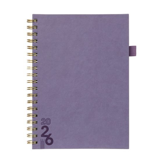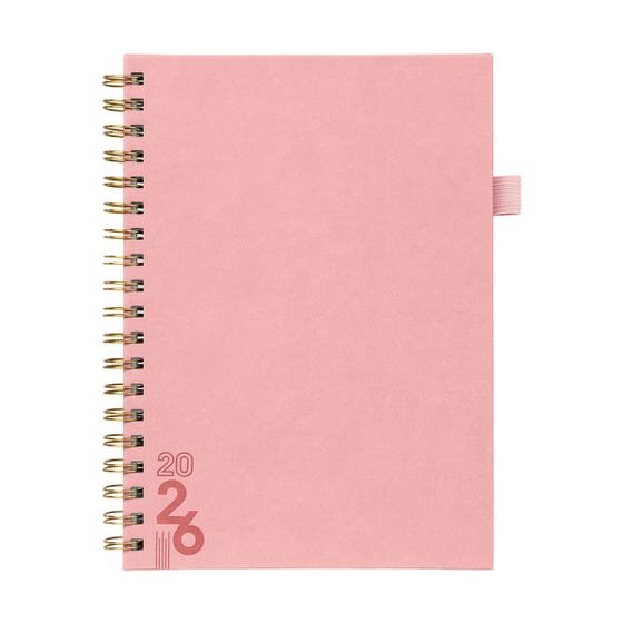 Agenda semanal con 80 hojas. Contiene datos personales, calendarios 2025-2026-2027, planeador 2026, seguimiento de nuevos hábitos, organizador de tareas, planeador de proyectos y días festivos. Incluye caja individual del mismo color a la agenda y bolígrafo.