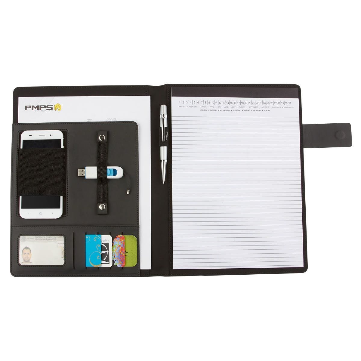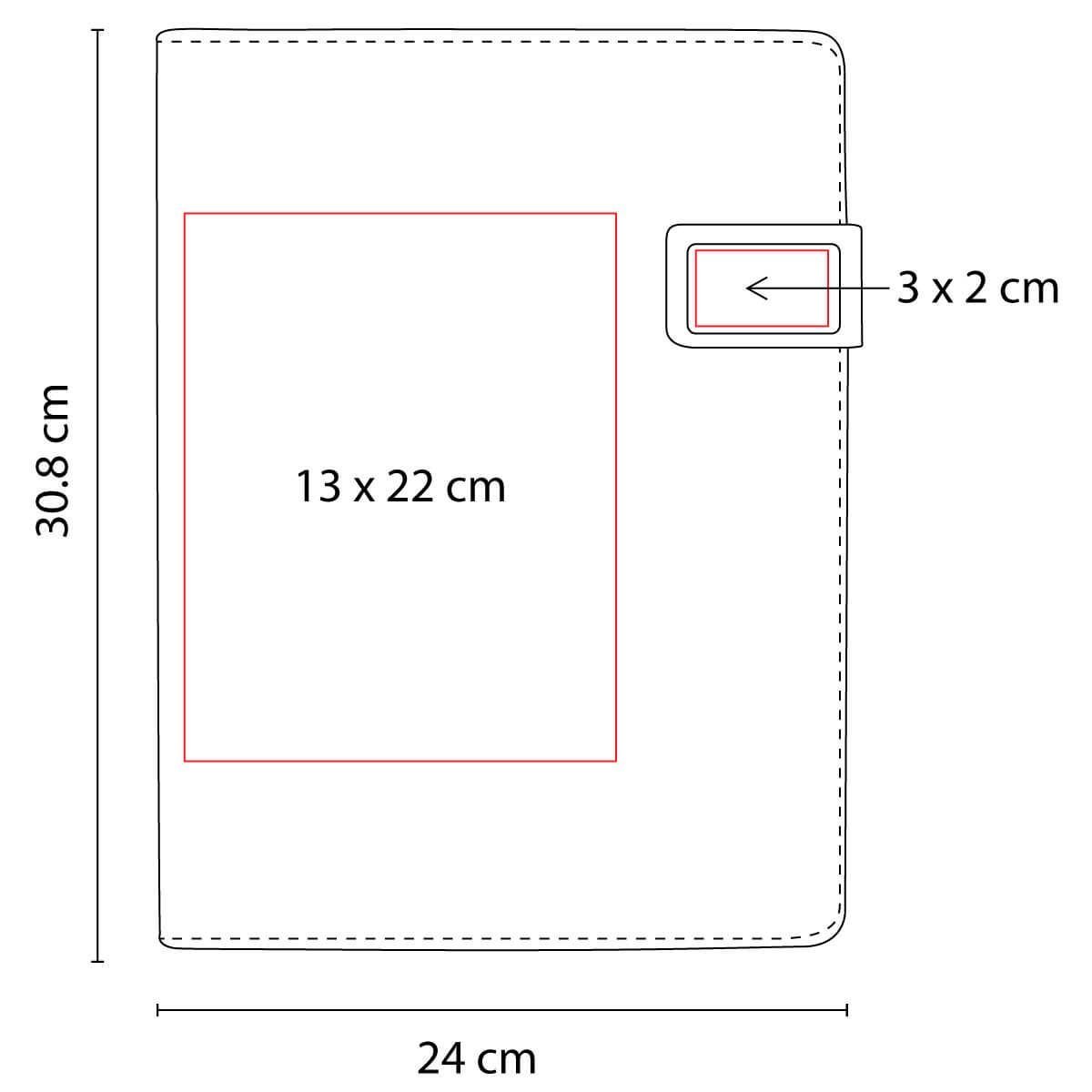 Incluye block de raya tamaño A4 con 20 hojas, elástico para bolígrafo, compartimento para smartphone y tarjetas. Broche magnético. No incluye bolígrafo.