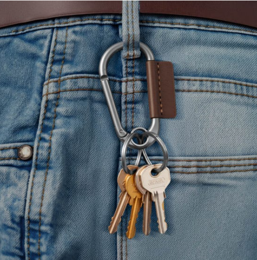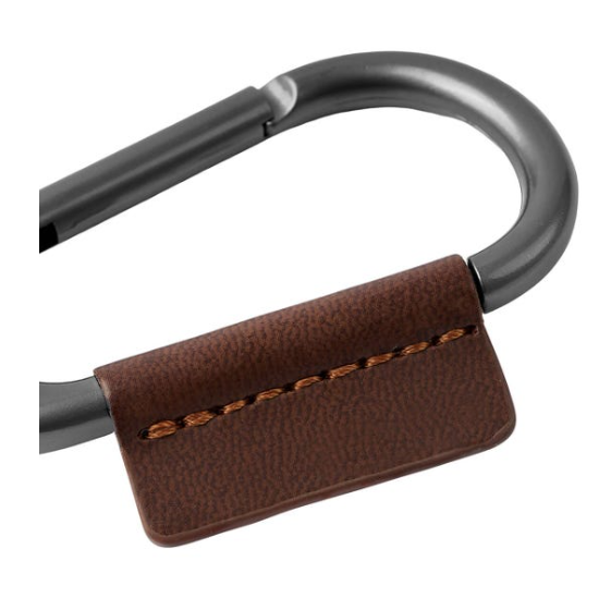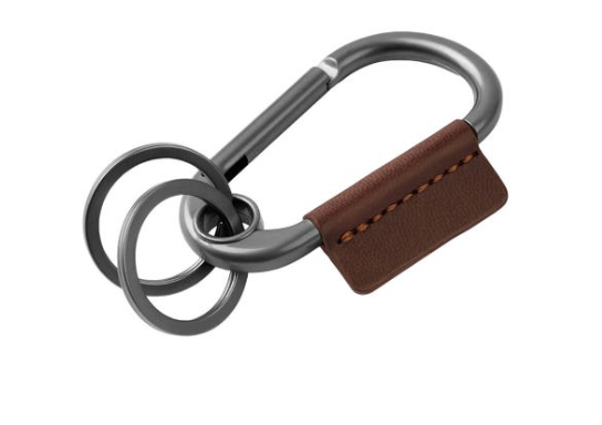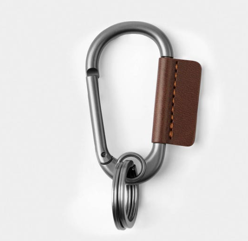 Llavero metálico con gancho tipo carabina. Incluye pieza de curpiel que estiliza su diseño y dos aros portallaves. Práctico para sujetar y organizar tus llaves con un toque moderno y funcional.