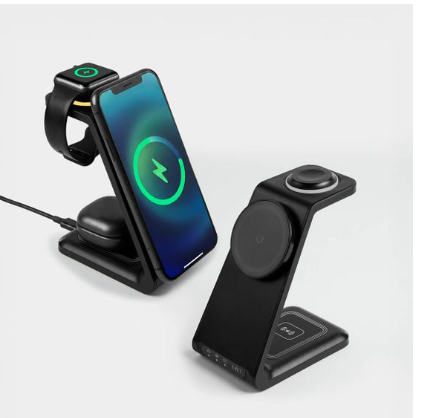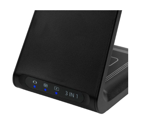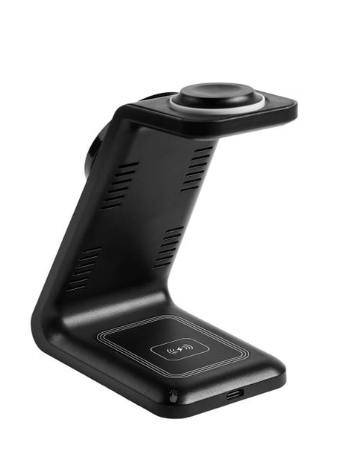 Cargador inalámbrico con triple función. Incluye estación de carga para smartphone, reloj inteligente y audífonos, permite la carga simultánea, además luz led indicadora de carga activa. Compatible con dispositivos de carga inalámbrica. Wireless de 15W / 10W / 7.5W / 5W / 3W. Incluye cable de 1m con conector tipo. Incluye caja individual.