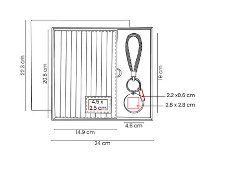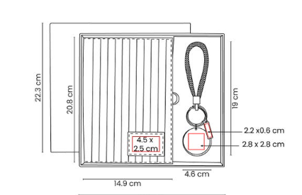| Área | 4.5 x 2.5 cm Libreta / 2.8 x 2.8 cm Llavero / 2.2 x 0.6 cm Placa / 18 x 16 cm Caja |