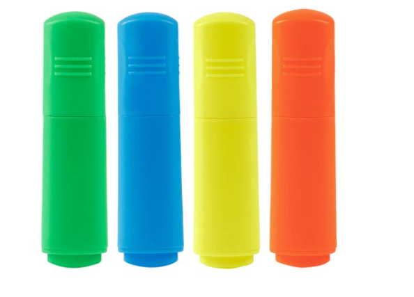 Incluye 4 marcatextos en colores azul, amarillo, verde y naranja, en un práctico estuche ecológico con ventana. Diseño compacto, ideal para oficina o escuela.