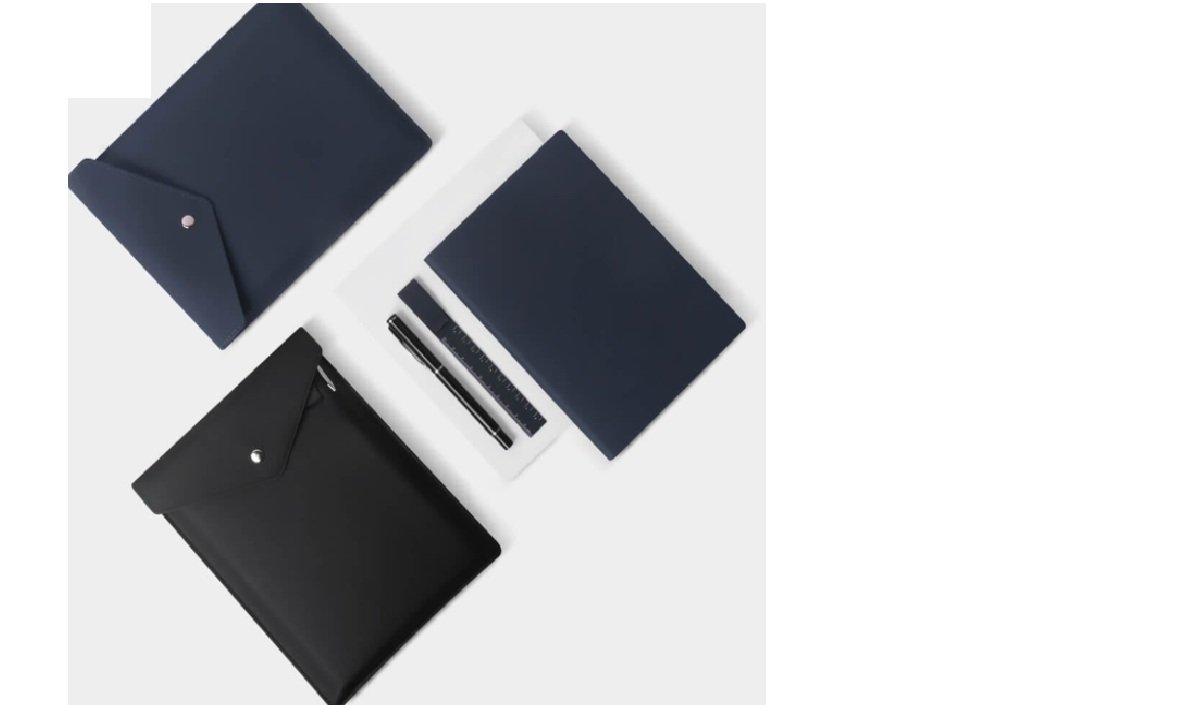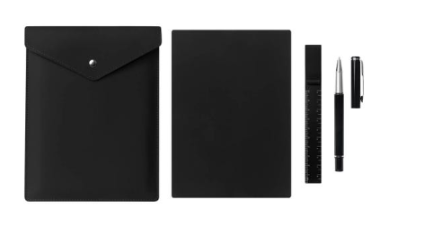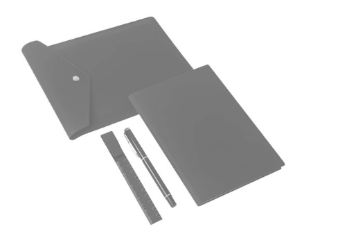 Set de libreta, regla y bolígrafo. Presentado en un elegante sobre de curpiel. Un conjunto esencial con diseño discreto y profesional: Libreta de 80 hojas a raya, bolígrafo metálico con detalles cromados y regla metálica de 10 cm. Todo cuidadosamente resguardado en un sobre de curpiel con cierre de botón, ideal para quienes aprecian lo práctico con un toque de distinción.