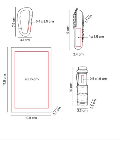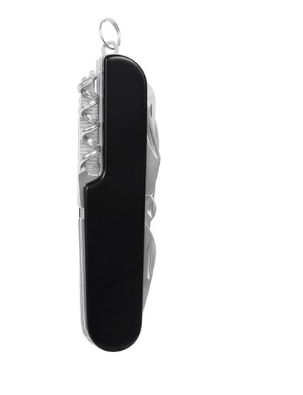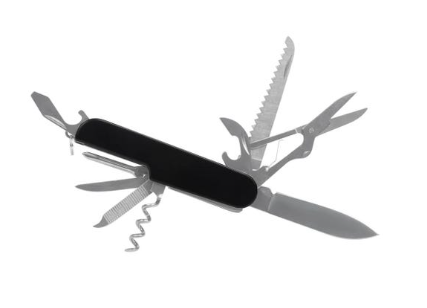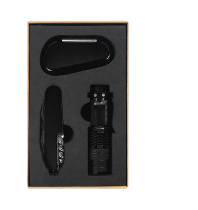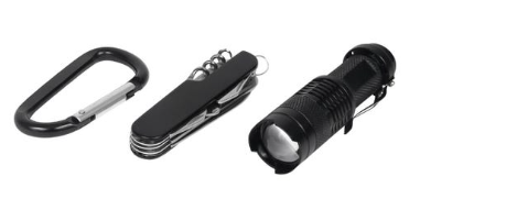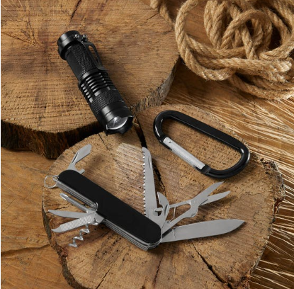 Set de herramientas multiusos. Incluye gancho metálico, lámpara con luz ajustable y navaja con 9 funciones: (navaja, sierra, tijeras, destapador, abrelatas, sacacorchos, guía de hilo, lima y desarmador de cruz). Incluye caja individual.