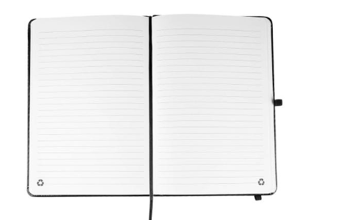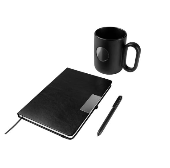 Set de regalo ejecutivo de 3 piezas. Contiene libreta de pasta dura con 80 hojas recicladas a raya y placa metálica. Incluye listón separador y elástico porta bolígrafo. Bolígrafo de plástico con mecanismo pulsador y taza de carámica con placa metálica circular. Capacidad de 473 ml. Incluye caja de regalo rígida.