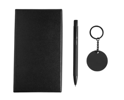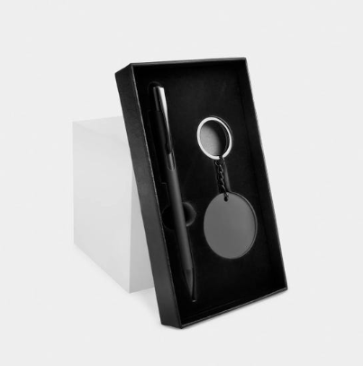 Set de regalo de 2 piezas. Contiene bolígrafo metálico con terminado rubber y mecanismo pulsador, además de un llavero metálico con terminado suave al tacto, que al grabarlo con láser, revela un efecto espejo que lo hace único y distintivo. Incluye caja de regalo.