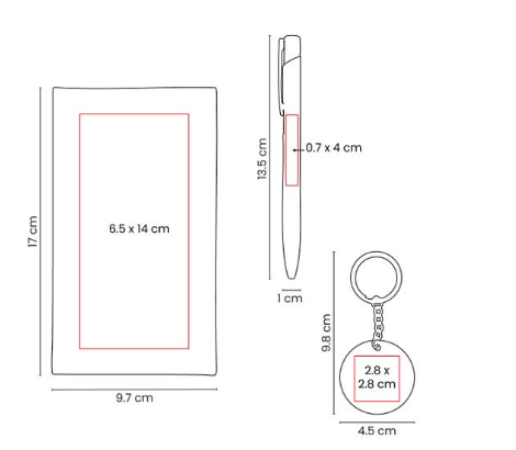 | Área | 6.5 x 14 cm Caja / 0.7 x 4 cm Bolígrafo / 2.8 x 2.8 cm Llavero |