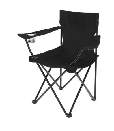 Silla plegable de fácil armado con reposabrazos, porta vasos de malla y funda con jareta y correa.