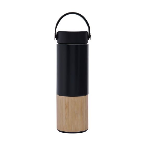 Termo doble pared con base de bambú. Cerrado al vacío. Pared interna y externa de acero inoxidable. Tapa de plástico con asa de silicón y cierre de rosca. Incluye caja individual.