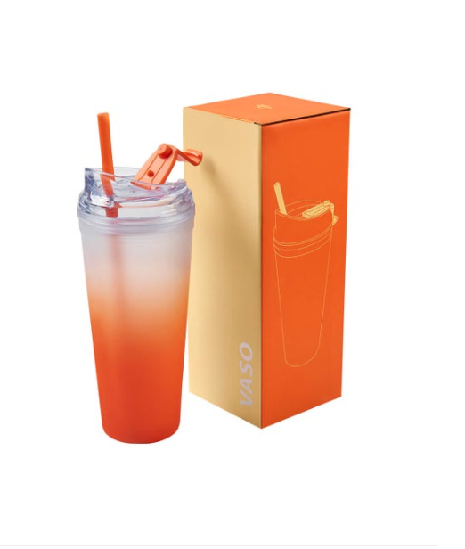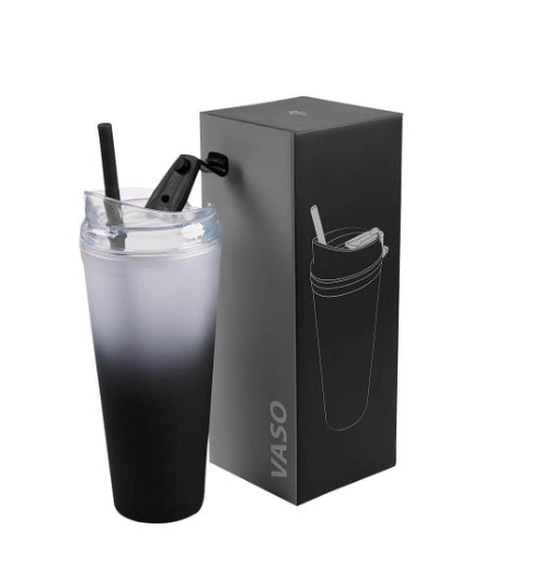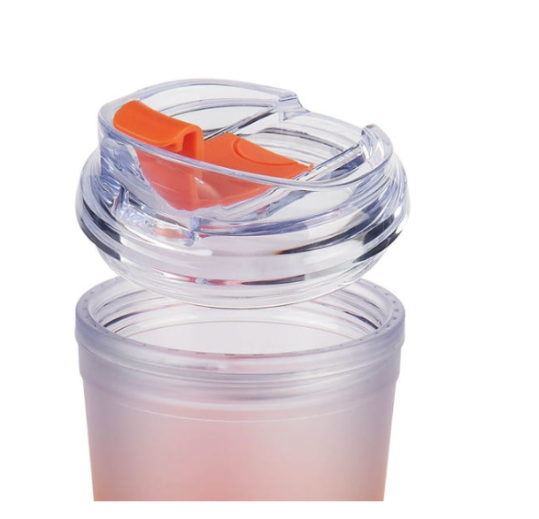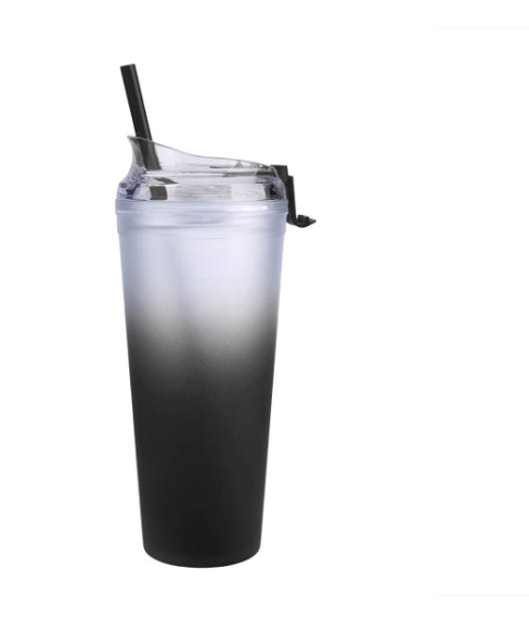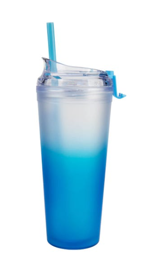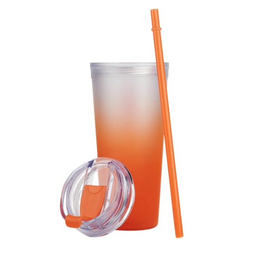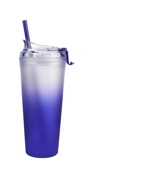 Vaso doble pared. Pared interna y externa de plástico. Tapa de plástico con sistema de rosca. Sobretapa con sistema push. Incluye popote. Cuerpo con terminado tipo rubber y degradado de color. Capacidad 24 Oz. Base de 7 cm de diámetro. Incluye caja individual.